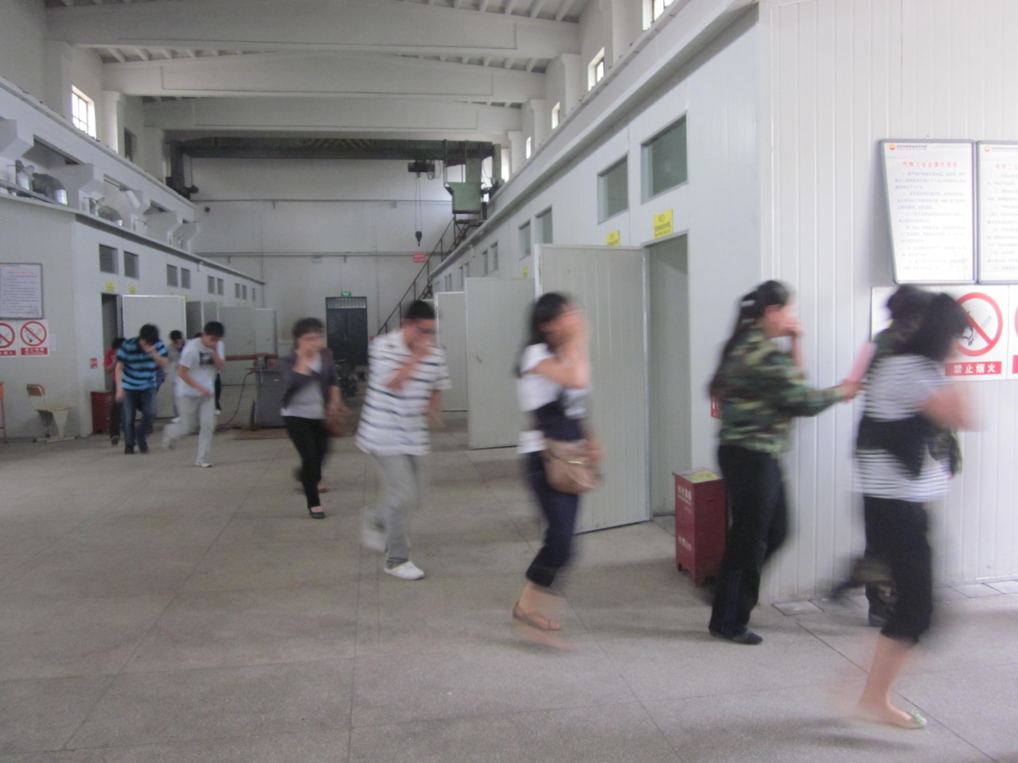下午18:20,随着响亮哨声,消防疏散演练指挥组下达了“焊接实训室发生火灾,请同学们立即撤离”的命令。只见同学们俯身并用纸巾、手套或衣袖等捂着口鼻在老师的指挥下,紧急有序地按指定的路线迅速撤离危险地带。整个撤离演练历时1分15秒,做到了快速、安全、有序。