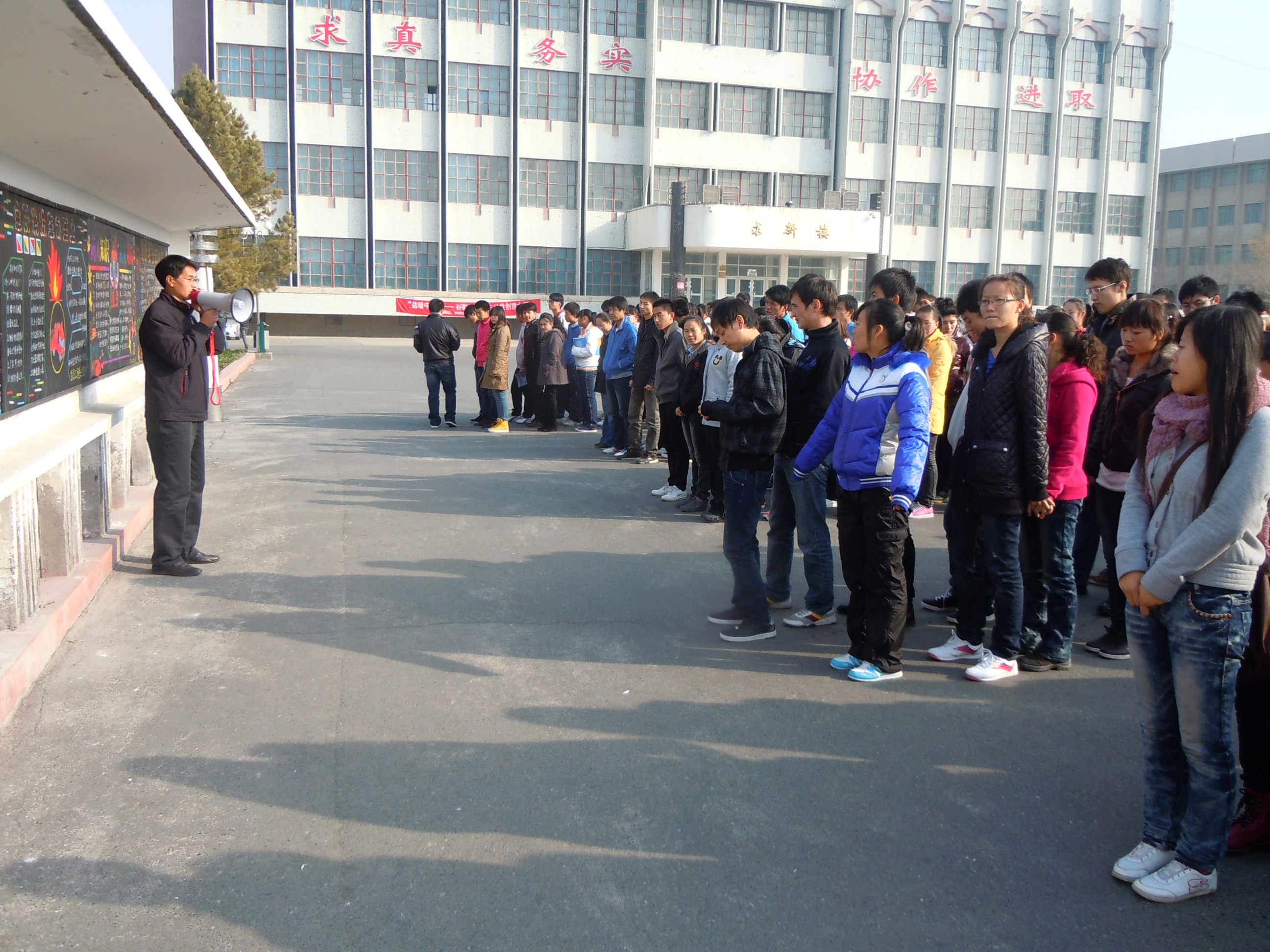经过精心的安排,此次演练得到大家的一致好评,演练一开始,首先由赵磊老师在各班进行演练开始之前的动员,说明本次演练的意义,以及一些应急疏散的安全常识,动员之后,由发令员发令,15:00正式开始进行演练,在各楼层负责的同学负责给逃生人员指引正确路线,在经过一系列演练程序之后,逃生的同学都能安全的撤离到制定地点,在信息工程系体育部的同学配合下完成整理队伍清点人数的收尾工作。最后,赵磊老师对此次演练进行总结,提出此次演练所存在的不足,同时再次强调了应急疏散知识的重要性。