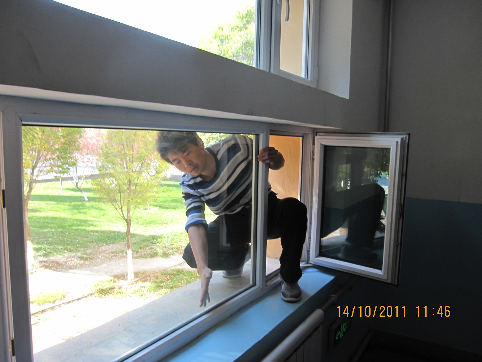 宿舍楼管理人员违章指派学生擦玻璃图片